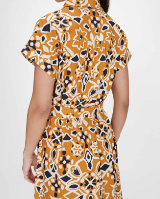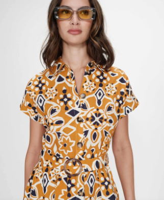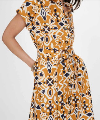 La robe chemise VIRGINIA est confectionnée en 100 % coton avec un imprimé d’inspiration sicilienne. La coupe évasée est agrémentée d’une ceinture à boucle à la taille qui souligne la silhouette. La robe imprimée VIRGINIA dispose de manches courtes à revers, d’une fermeture boutonnée sur le devant et de poches latérales.