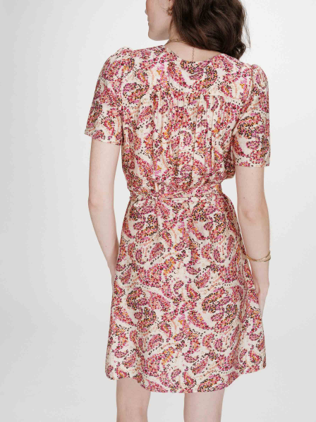 La robe courte VICTOIRE est confectionnée dans un tissu imprimé cachemire. Le modèle présente des manches courtes bouffantes, une encolure en V et une ouverture boutonnée sur le devant. La robe imprimée VICTOIRE dispose d’un lien à nouer au dos, permettant d’ajuster la taille et de structurer la silhouette. Les fronces aux épaules et les volants apportent féminité et raffinement au modèle